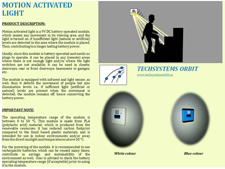 Motion Activated LightMotion activated light is a 9V DC battery operated module, which senses any movement in its viewing area, and the light is turned on, if insufficient light (natural or artificial) levels are detected in the area where the module is placed. For further information, please refer to Products - Motion Activated Light.